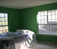 The dining room’s ceiling and walls were heavily damaged by water. We installed new drywall and texture to match the existing wall. We also gave the room new baseboards, ceiling lights, and a bamboo floor, and painted the room with a custom blend of spring green and blue hues.